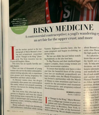 In 2015 The Shane Foundation proudly sponsored a presentation by Olympic athlete Megan Henry, the survivor of a near-fatal hormone-based contraceptive-related pulmonary embolism featured in the 2014 "Vanity Fair" expose by Marie Brenner, "Danger in the Ring" and followed up with the publication of Shane Foundation Co-Founder, Roberta Gold's featured letter published in "Risky Medicine", "Vanity Fair" March, 2014.